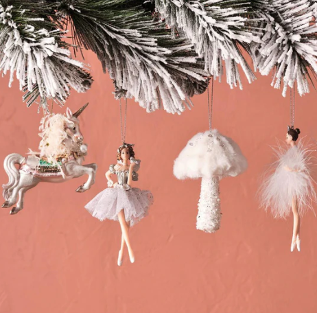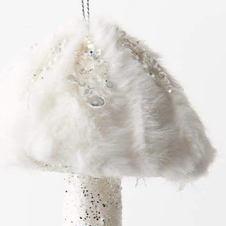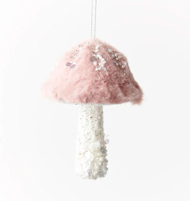 Pretty white or pink mushroom ornaments to decorate your home at Christmas time.