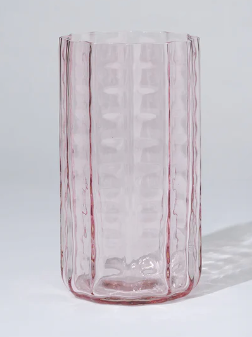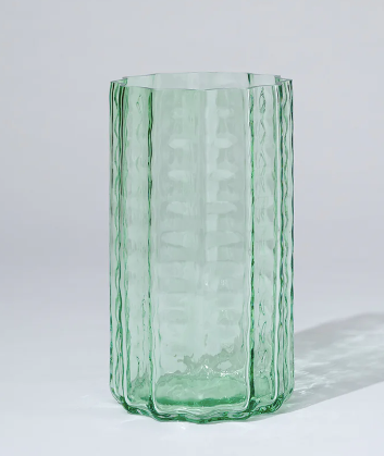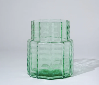 The "Jelly Vase" is a collection of vases by Marmoset Found, known for their playful, sculptural shapes and translucent coloured glass. The collection includes various sizes (small, medium, large, and squat) and colors (green, honey, and pink). These vases are designed to be both functional and decorative, with a rippled finish that adds texture.