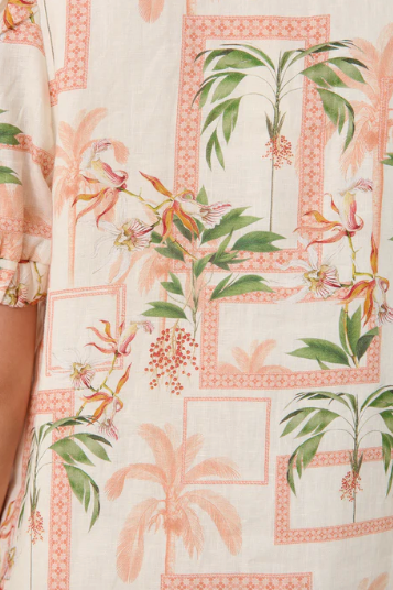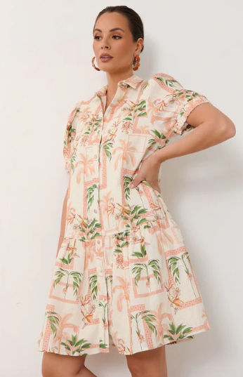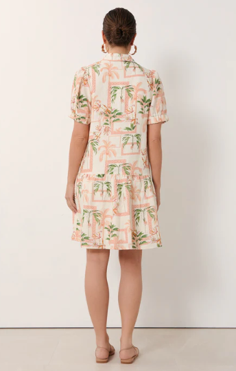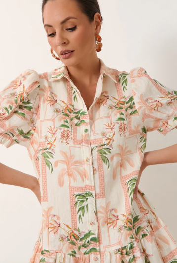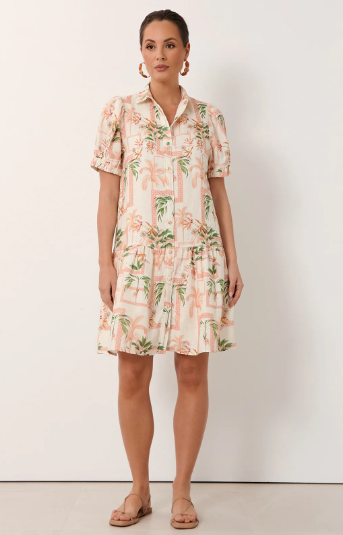 The Daniela Linen Short Dress in print is crafted from 100% linen. It features a button-down front with self-covered buttons, short sleeves with elasticated cuffs, and a tiered hem. Fully lined for comfort.