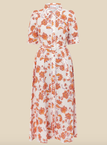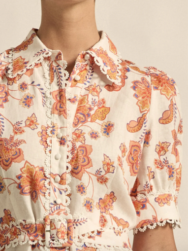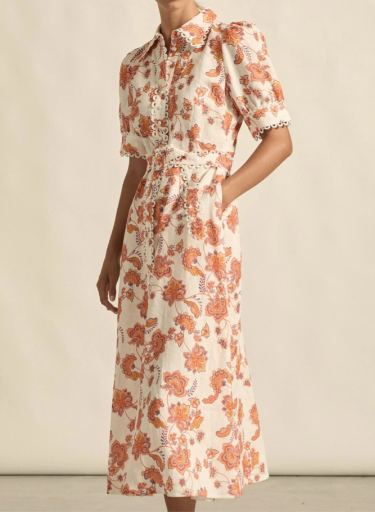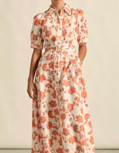 zoe kratzmann’s Yearn Dress is a romantic ode to vintage femininity, crafted in crisp, breathable linen and decorated with vibrant florals in warm citrus tones.