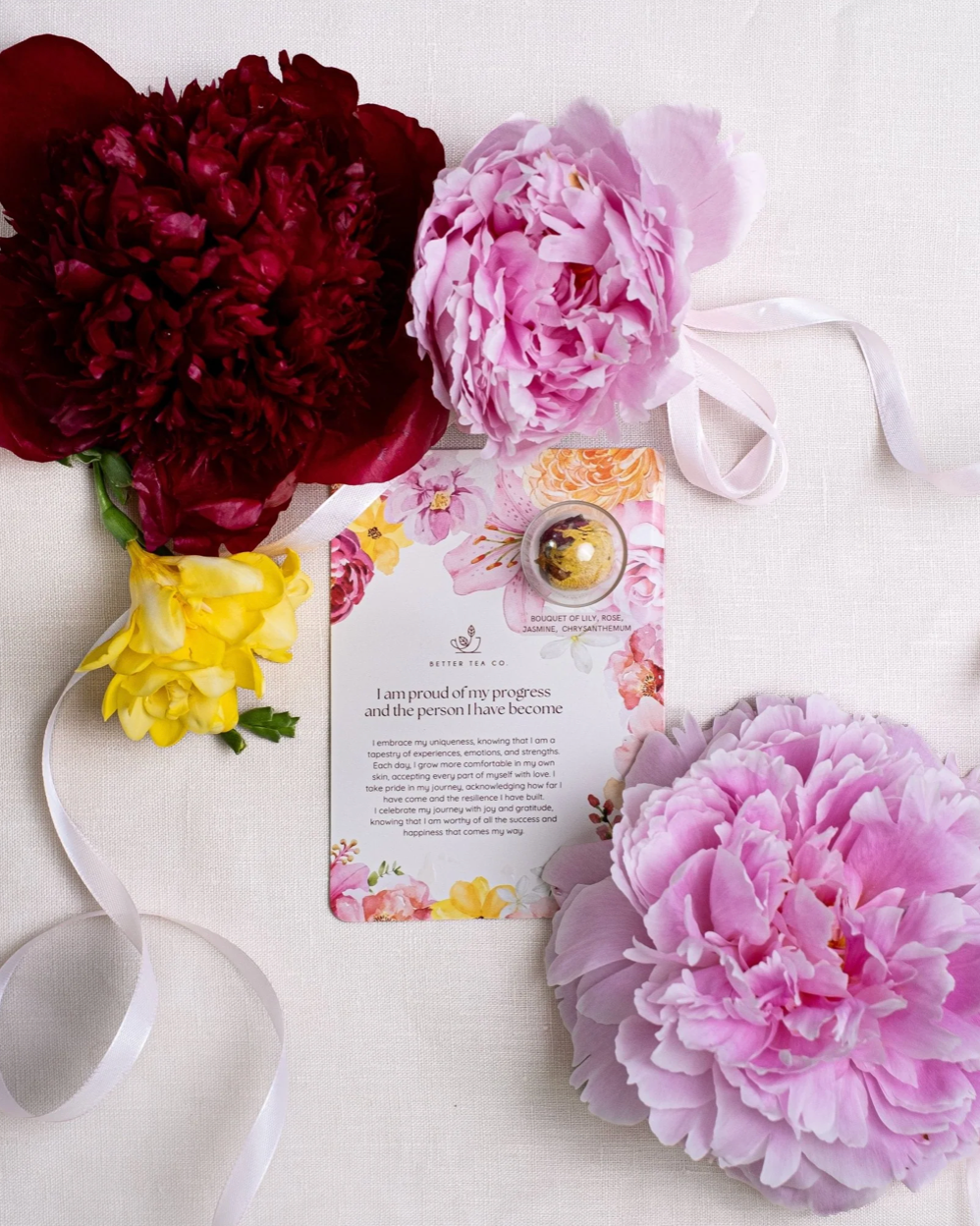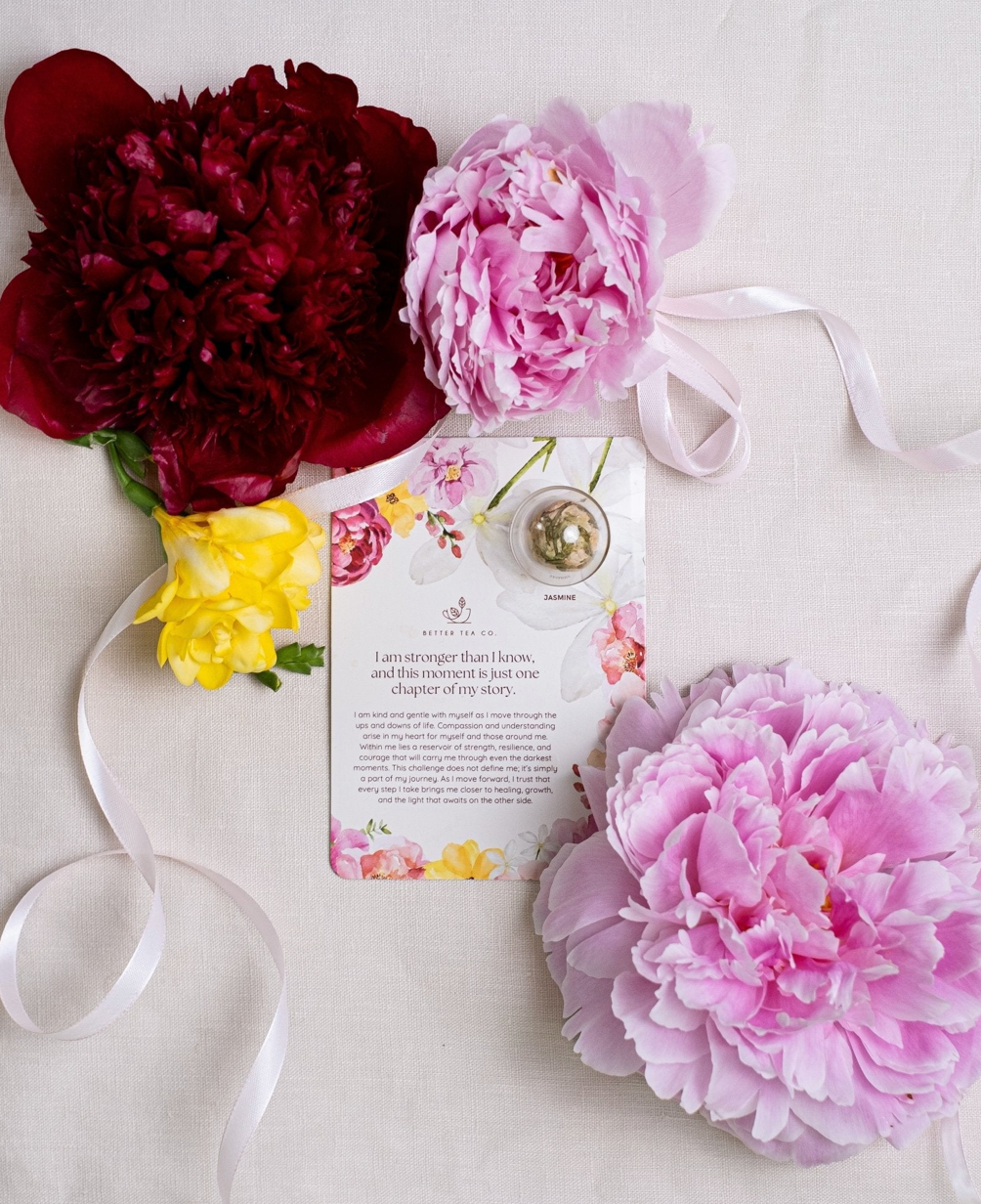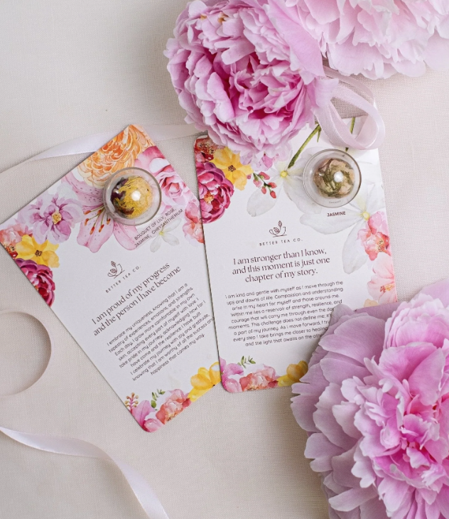 Each card features a handcrafted blooming tea ball, paired with a heartwarming positive affirmation on the front to inspire and uplift.