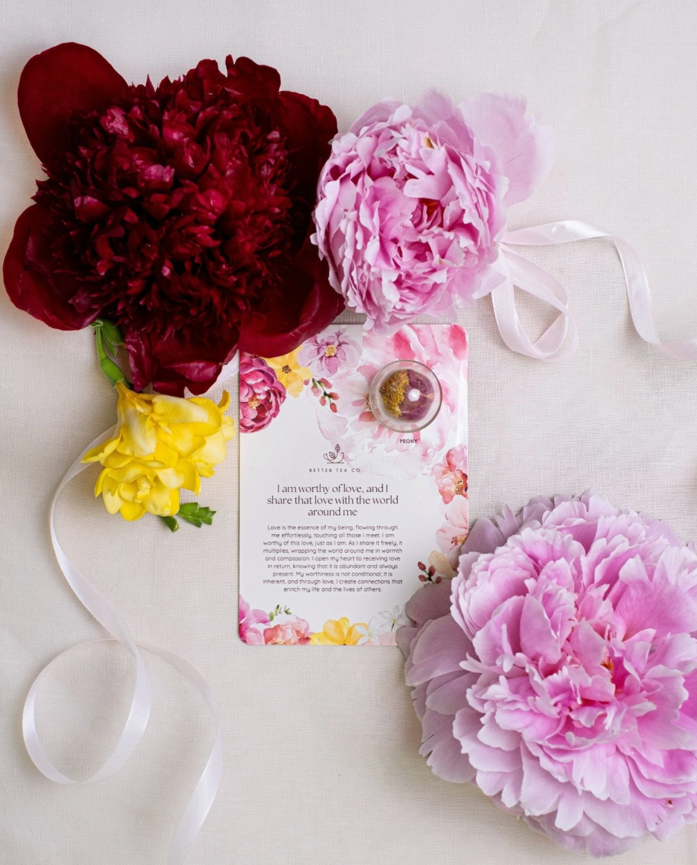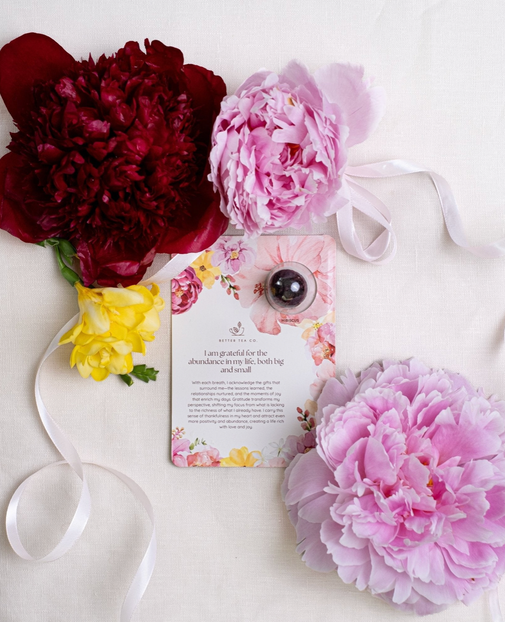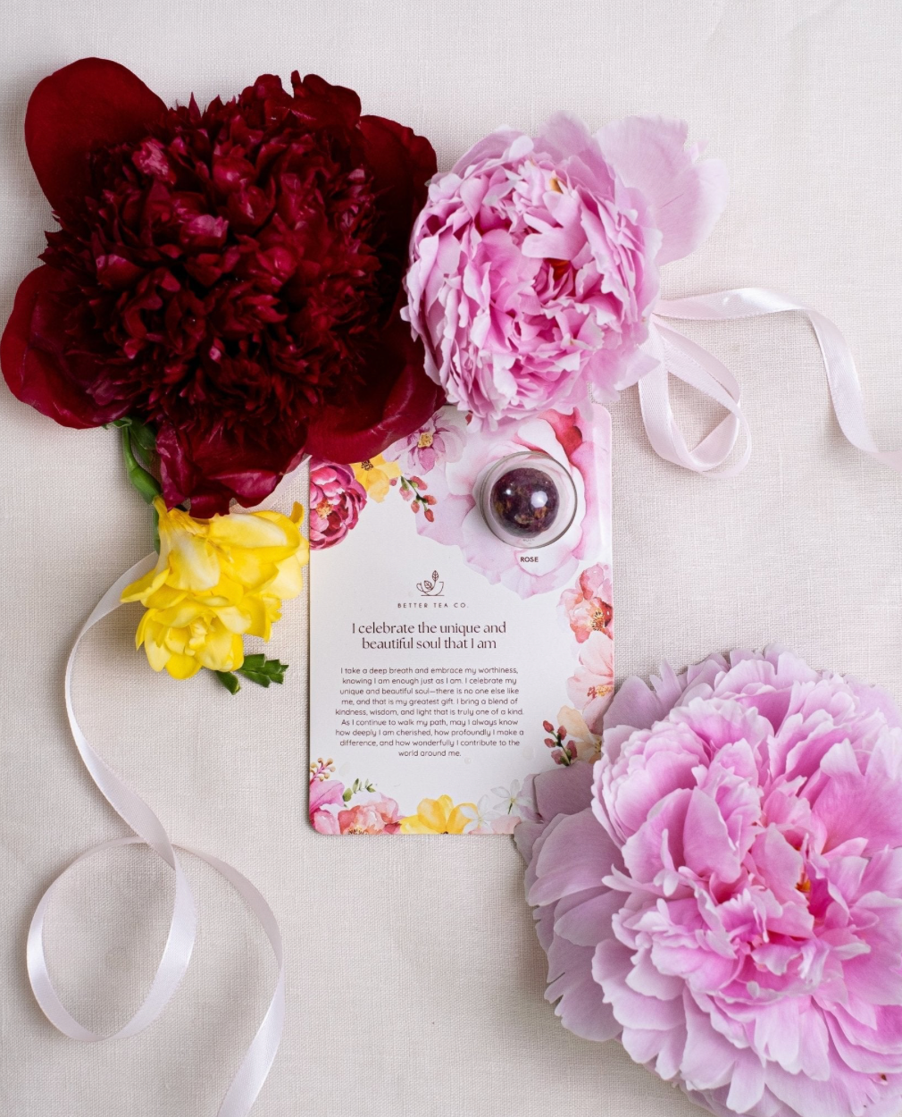 Each card features a handcrafted blooming tea ball, paired with a heartwarming positive affirmation on the front to inspire and uplift.