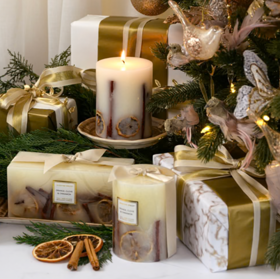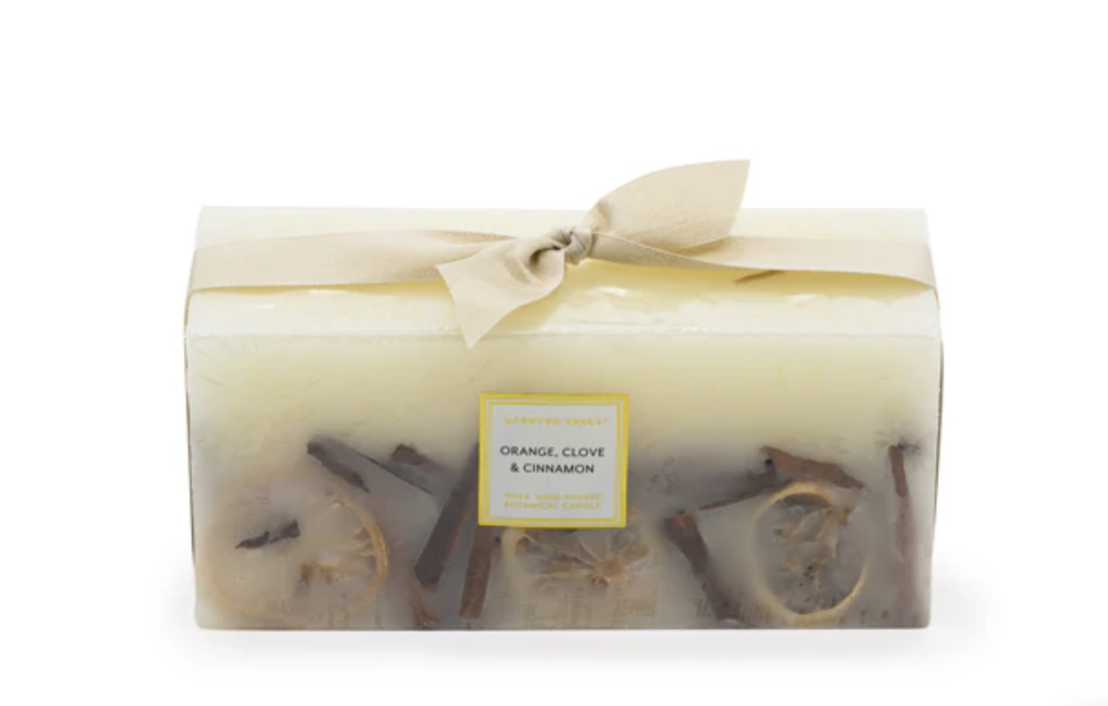 A hand-poured rectangle candle, decorated with festive botanicals for a feast for the senses. Exotic notes of ylang-ylang, lily, sparkling citrus, and warm clove and cinnamon fill your home with festive luxury. Finished with a champagne ribbon, it’s gift-ready. A festive flourish for every corner of your home.